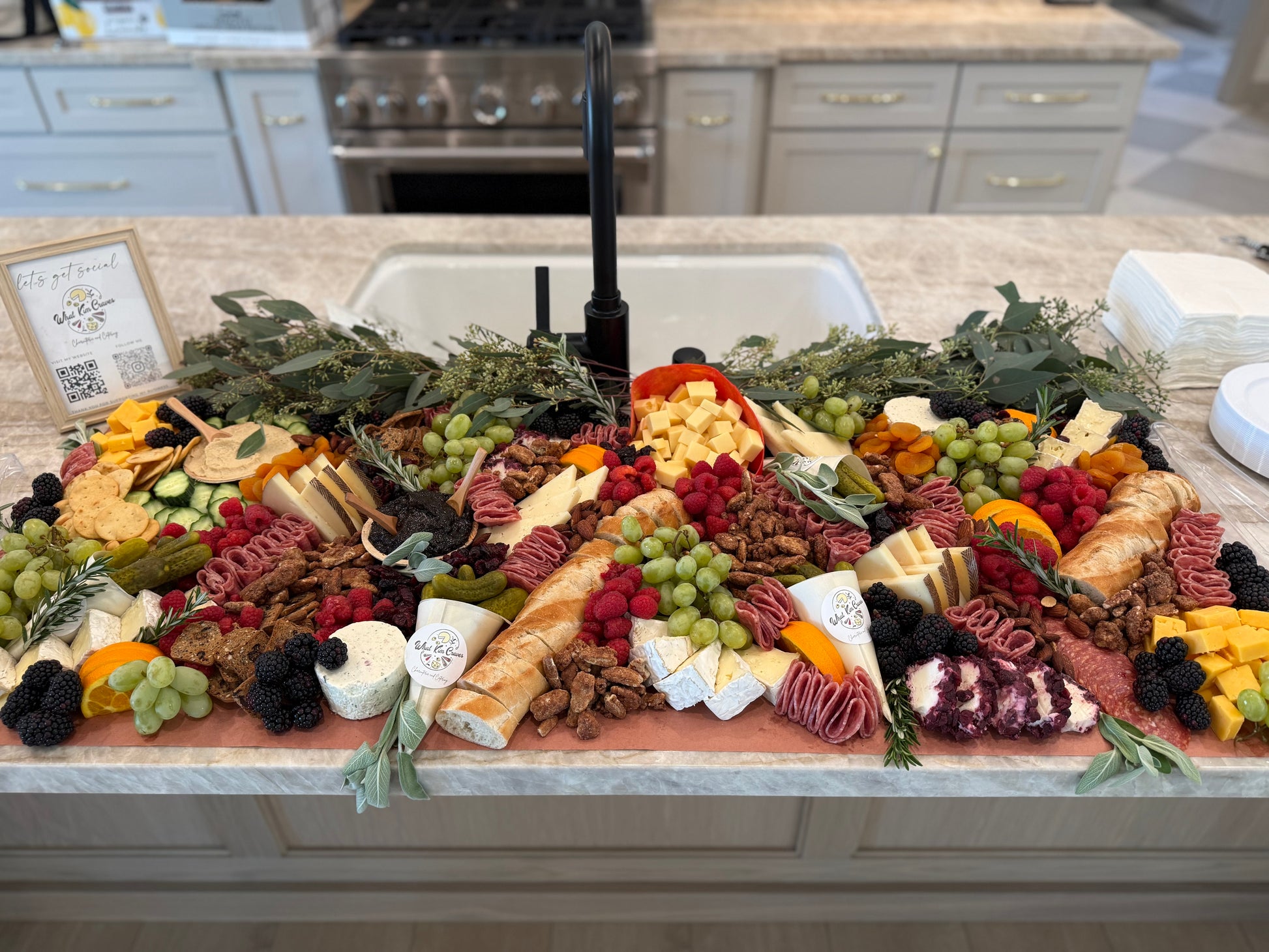 4 feet of beautifully arranged charcuterie on butcher paper. using palm leaf bowls and accents.